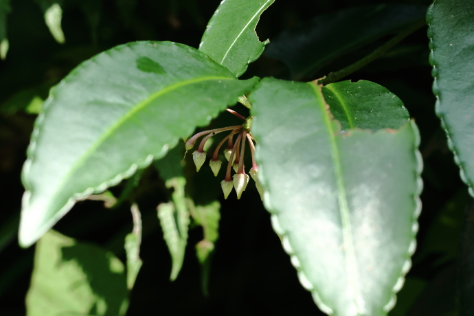 森のあちらこちらの小道の傍らに多数見られます。常緑の低木で、冬も鮮やかな緑色の葉を保ちます。葉は互生で密集し、濃緑で光沢があり、縁には波状の鋸歯があります。