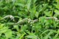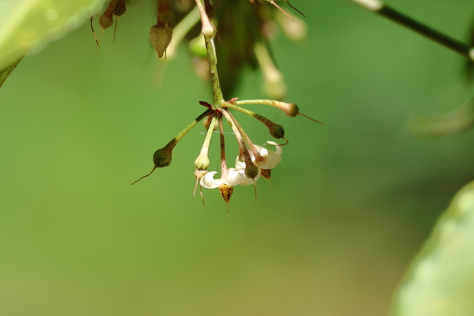 葉の下を覗くと、葉陰から花序を伸ばし、蕾をつけていました。枝先に散房状の花序をつくり、白い花を下向きに付けます。花序柄が短く、散形状に見えることもあります。