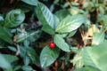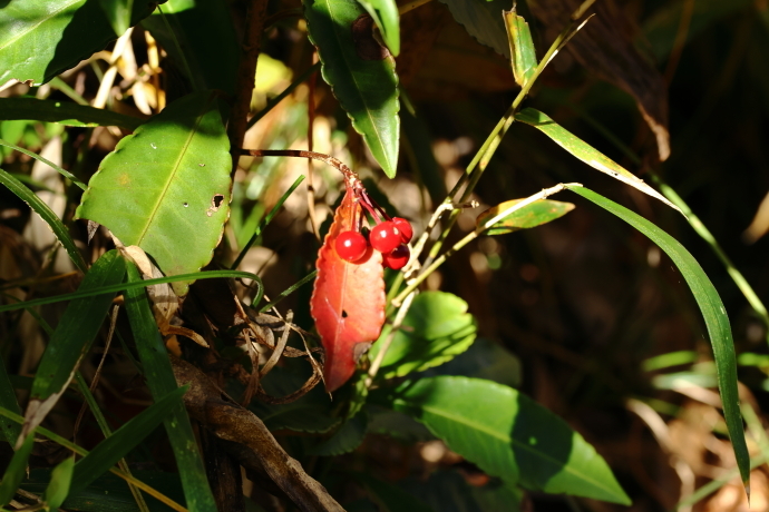 紅葉した葉を見つけました。赤く実った果実の下の葉で、同じように赤く染まっています。常緑樹でも更新のために古い葉を落としますが、その前に赤く色付くことがあります。