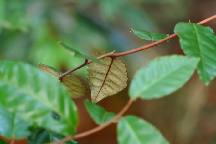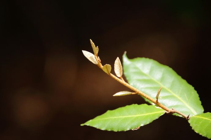 新葉が出てきました。褐色でザラザラしています。葉の裏表とも鱗状毛に覆われ、熟す前の果実とよく似た色合いです。成長すると葉表の鱗状毛は無くなります。