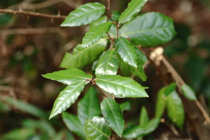 森のあちこちで見かけます。葉は光沢があり、縁は波打ちます。茎には枝が変化した棘が多数あり、枝先の棘を他の木に引っ掛けて、垂れ下がる枝を支えます。