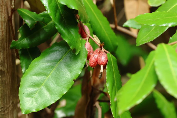 果実が付いています。「ナワシロ」は、田に苗代をつくる5月頃に果実が赤く色づくことに由来し、「グミ」は、棘のある木に成る「グイミ」と呼ばれる実から転じた名とされます。