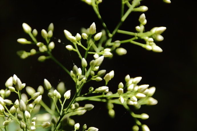 茎頂近くの葉腋から円錐花序を出します。基本は花軸から順に花柄を出す総状花序ですが、何度も枝分かれし、全体として円錐状に展開します。先に1つの白い蕾が付きます。