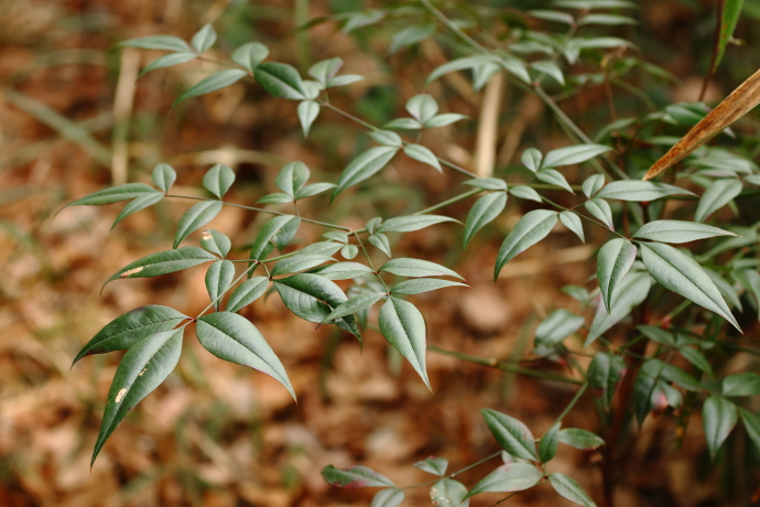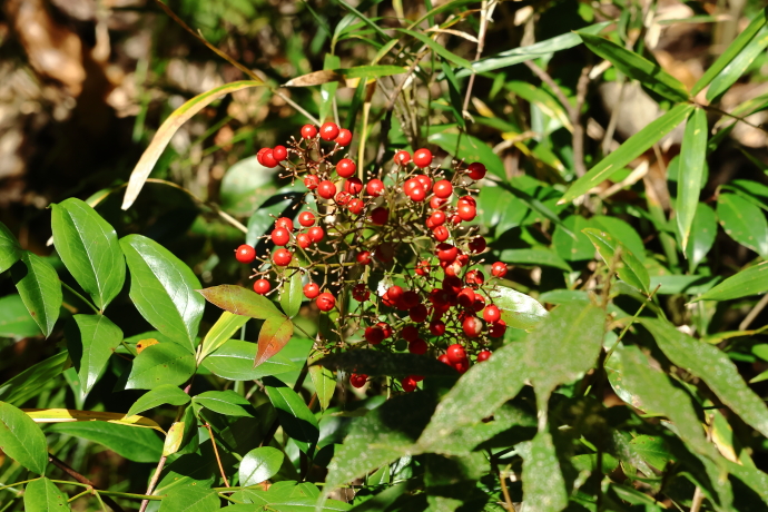 中国での名称「南天竺」や「南天燭」などが簡略化されて名付けられました。光沢のある三回奇数羽状複葉と赤い果実が特徴で、「難を転じて福となす」に通じる縁起木です。