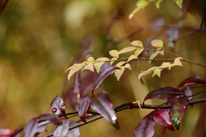 新枝と旧枝の葉が上下に並んでいます。常緑樹でありながら紅葉する種のひとつで、下の旧葉は紅葉しています。上の新葉は淡い黄緑色ですが、成長とともに濃緑に変化します。