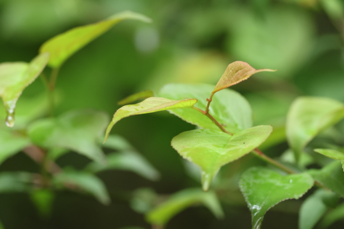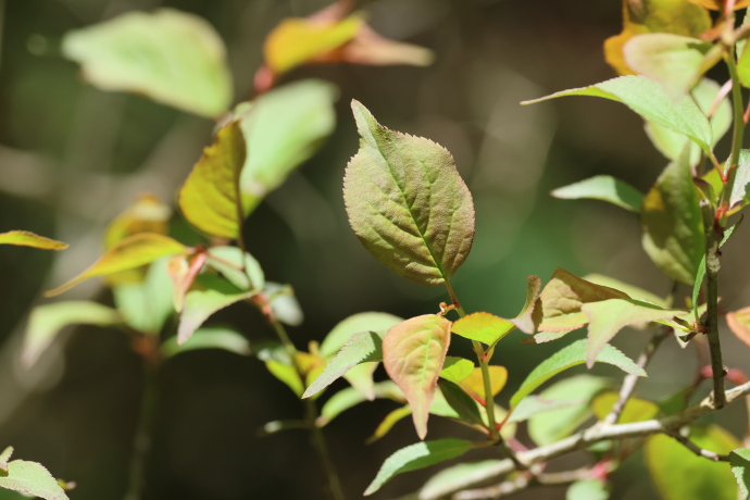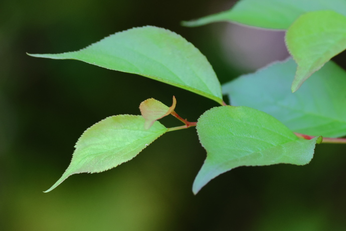 葉は互生し、卵形または倒卵形で、先端は尖っています。縁には細かい鋸歯があり、両面や葉柄には微毛がついています。葉身基部または葉柄上部には蜜腺があります。