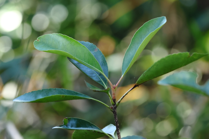 葉は互生し、長楕円形で、縁には丸みのある浅い鋸歯が並びます。革質で硬く、表面には強い光沢があります。枝の先端に葉が集まってつくため、車輪状に見えます。