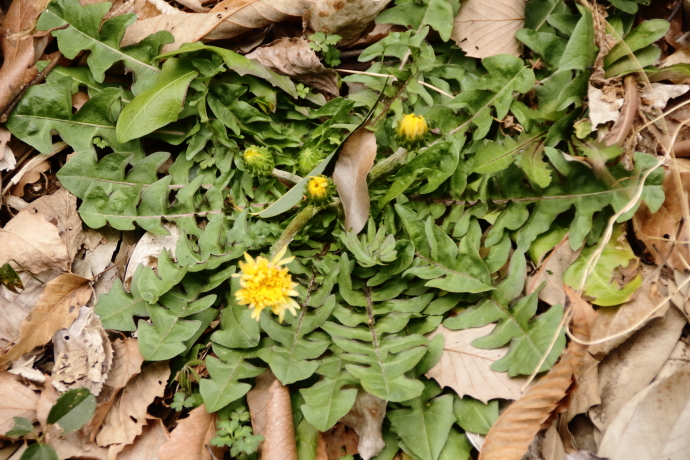 ロゼット状に根生葉を広げ、日光を全身で浴びています。葉は倒披針形で羽状に深裂します。冬緑型のライフサイクルを持ち、夏には葉を枯らし、秋に再び葉を増やします。