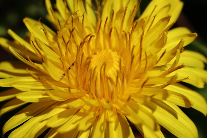 頭状花は筒状花がなく、黄色い舌状花が並びます。雄しべは5本あり、葯が合着した集葯雄しべが雌しべ1本を囲みます。中から柱頭が伸び、雌性期に入ると柱頭が二裂します。