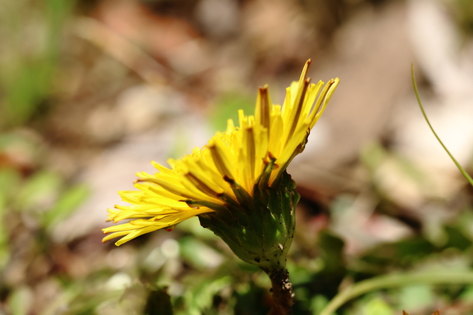 蕾がついています。総苞外片は内片の概ね1/2以上あり、内外片ともに角状突起を先端につけています。トウカイタンポポと比べると、角状突起はやや小さく控えめです。