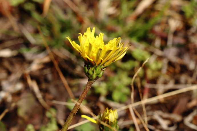 花茎がロゼット葉から伸び、先端に頭状花をひとつ付けます。花茎は赤紫色で、折ると白い乳液が出ます。中は空洞で、開花期の速い伸長を助けていると考えられます。