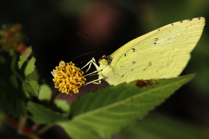 複眼は間近で見ると迫力があります。黄色く、擬瞳孔がこちらを向き、薄っすらとした黒い斑紋が入っています。翅裏には多数の黒点がありますが、翅表は見せません。