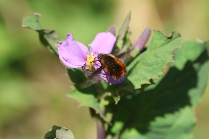 ムラサキハナナで吸蜜しています。コハナバチ類が春先に作る巣穴に卵を産み付ける習性があり、春先にだけ見かけます。成虫の寿命は短く、初夏には姿を消します。