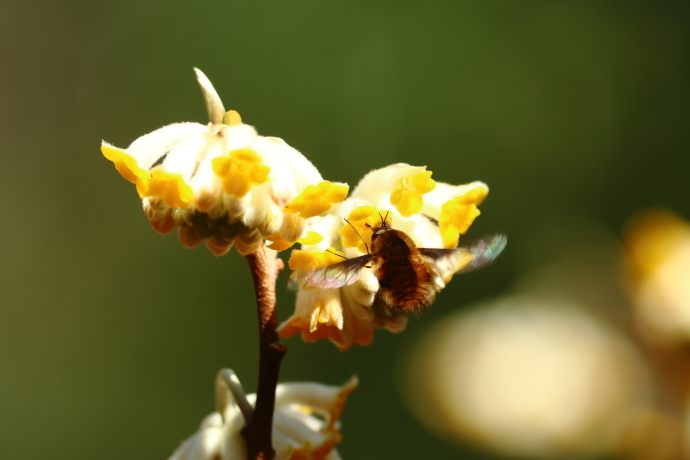 ミツマタの黄色い花の前で羽音を立てながらホバリングし、長い口吻を花筒に差し込んでいます。空中に吊られているように停止する姿が、「吊り(つり)」の名の由来です。