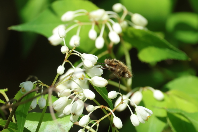こちらはミツバウツギに寄っています。ミツマタ、ムラサキハナナ、ミツバウツギなど、深い花筒の底から長い口吻を使ってホバリングしながら吸蜜するのが得意です。