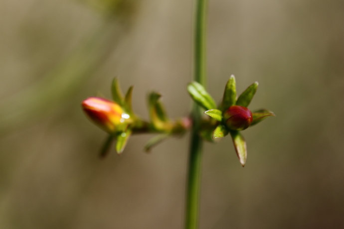 蕾は赤褐色を帯びて膨らんできました。蕾の基部では深く裂けた細長い萼片が開いています。萼は緑色で6~8裂し、裂片は細長く、花の基部を包むように存在しています。