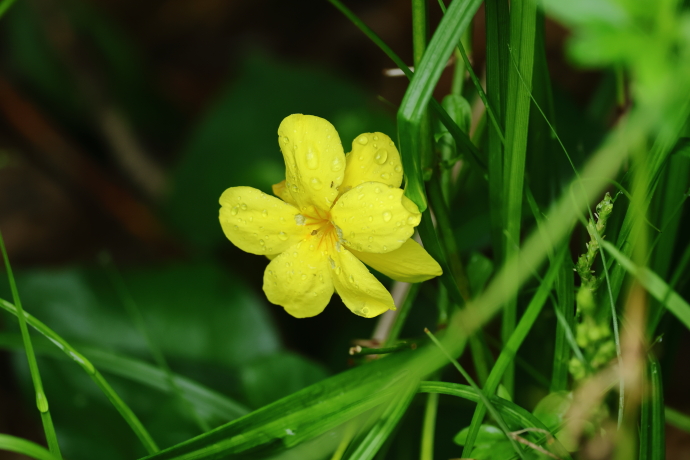 葉腋から花柄を伸ばし、鮮やかな黄色の花をひとつ付けます。基部でつながる高杯形の合弁花で、6~10の裂片に分かれ、八重咲きのように重なって平らに開きます。