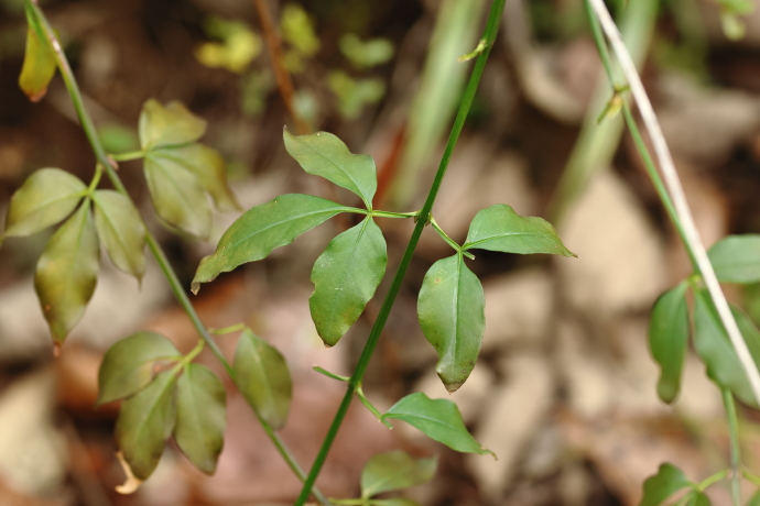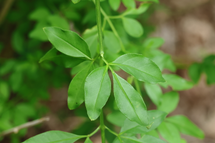 枝は細長く、上部で垂れ下がるように伸びます。若枝は緑色で稜があり、断面は四角形です。葉は対生の3出複葉で、小葉は狭卵形から狭楕円形をなし、葉縁は全縁です。