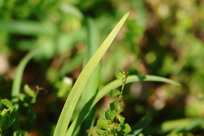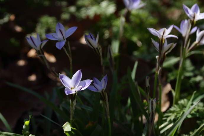 花弁の裏側にも紫色の線があります。風通しの良い道端で木漏れ日を浴び、気持ち良さそうに見えます。見ているだけで気分爽快ですが、葉にはニラの香りが漂います。