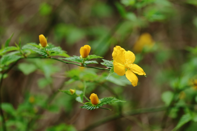 森の一画が黄色に染まっています。名の由来には、枝が風に揺れる様子「山振り(やまぶり)」や、黄色く彩る様子「山春黄(やまはるき)」が変化したとする説があります。