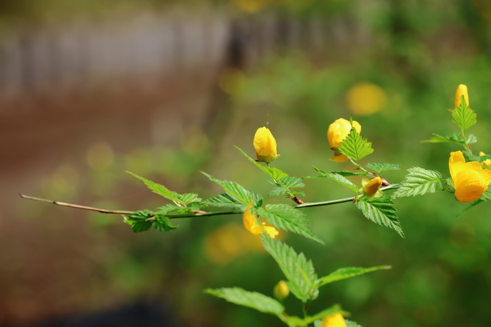 株立ちする低木です。既存の枝の葉腋や地下茎から新枝を出し、先端付近の葉腋に一輪ずつ花をつけます。黄金色に染まるほど一斉に開花し、広がりのある花姿になります。