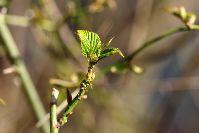 花芽は前年の夏~秋に伸びた充実した新枝の葉腋に形成されます。新枝は鮮やかな緑色で、柔らかくしなやかで、稜があります。経年とともに褐色に変わるため、識別できます。