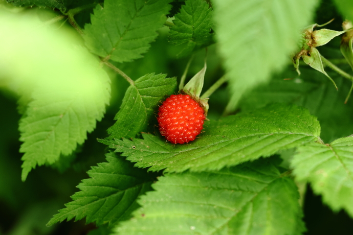 果実は、花床が赤く熟した偽果に痩果が並ぶ集合果です。直径約1cmほどの大きなイチゴになります。この時期、本種やヘビイチゴなど、野には多数のイチゴが熟しています。