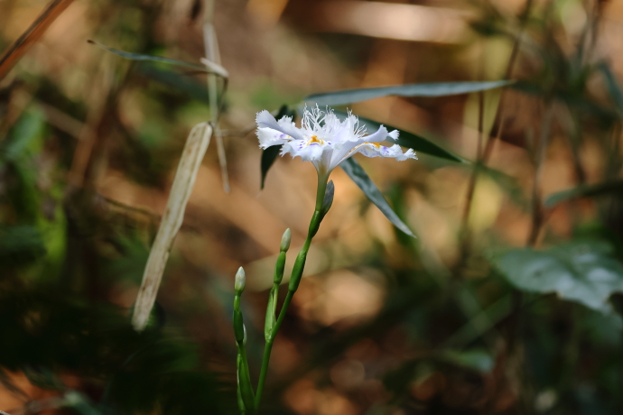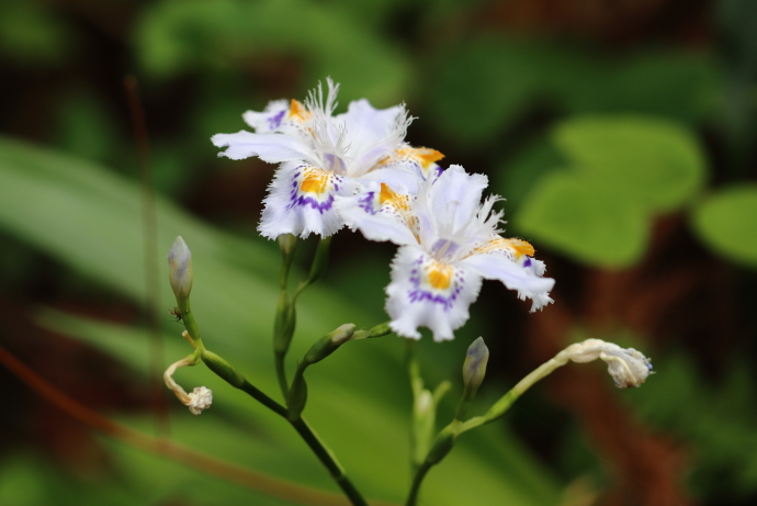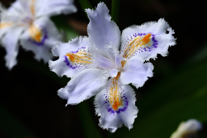 外花被片には橙黄色の斑点と、それを囲う淡紫色の斑点があり、縁は細かく切れ込んでいます。内花被片はやや細く、白色です。中央には3裂した白い柱頭が立っています。