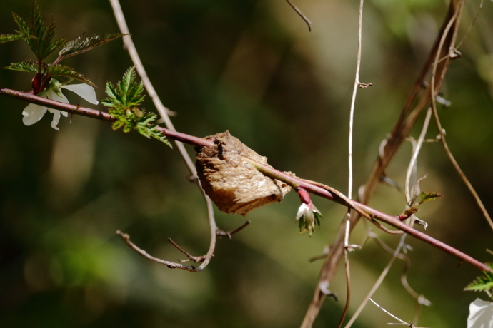 卵鞘を見つけました。薄茶色でスポンジ状の釣鐘型をしており、やや幅広く丸みがあります。チョウセンカマキリの卵鞘は細長く、縦に筋が二本入り、形が異なります。