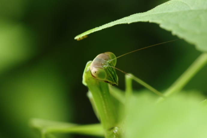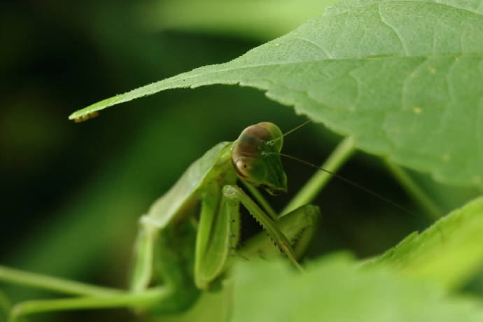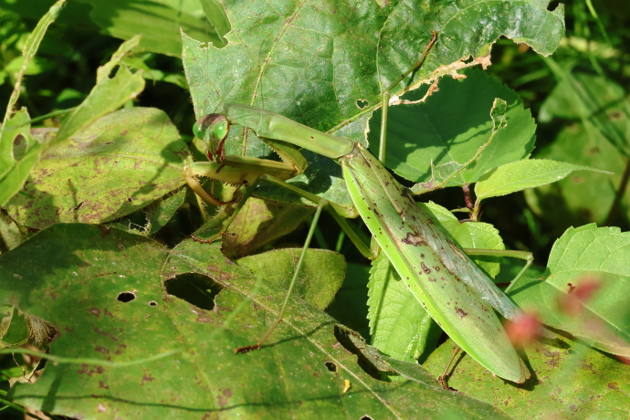 成虫に出会いました。偽瞳孔がこちらを向き、睨まれているように感じます。前足の付け根の間はくすんだ黄色で、鮮やかな橙色のチョウセンカマキリとは異なります。