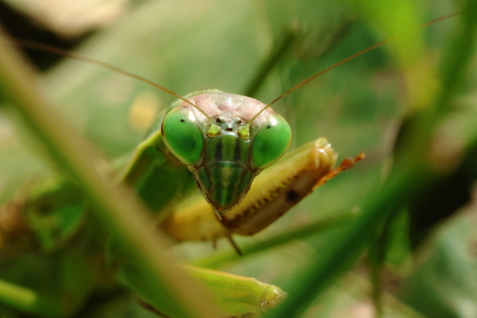 頭部は逆三角形で、左右に緑色の複眼が飛び出しています。3つの単眼下の前頭部に3本の縦線があります。中央の線は薄く細く、太く濃いチョウセンカマキリとは異なります。