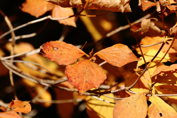 紅葉が進み、赤みを帯びた鮮やかな橙色に染まっています。紫色や赤みの強い橙色に色づくこともあるようです。茎頂には冬芽が付いており、細いため葉芽と思われます。