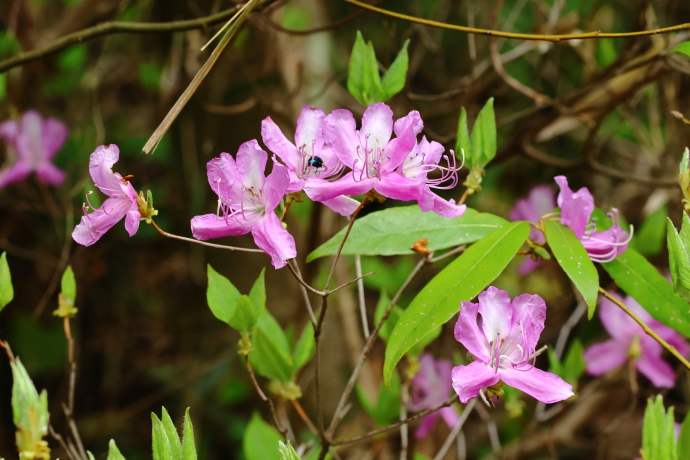 関東に多く分布し、名に「東国」を冠しています。「ミツバツツジ」は枝先に三枚の葉が輪生することに由来します。林縁で日光のスポットライトを浴びています。