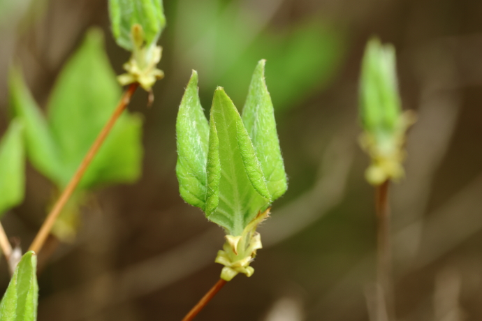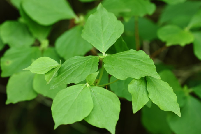 枝先に輪生した3枚の葉が開いています。葉は菱状卵形で先端が尖り、縁は全縁でやや波打っています。成葉になると無毛になる傾向があり、葉の表面に毛は見られません。
