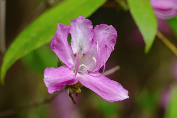 花冠は淡紅色の漏斗形で5深裂します。雄しべは長短合わせて10本あり、雌しべは1本で花柱下部に腺毛があります。ミツバツツジは雄しべが5本で、腺毛はありません。