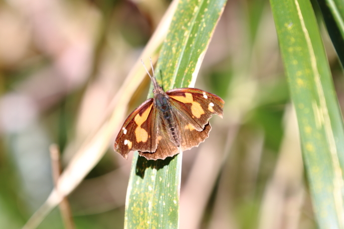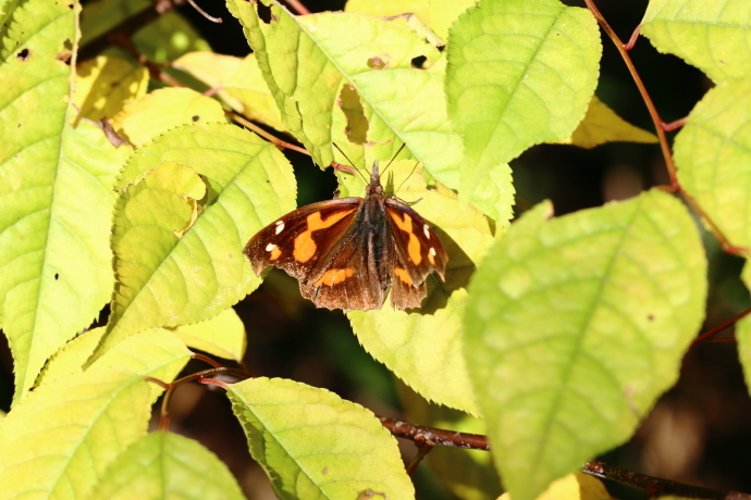 森の小道で突然舞い上がりました。日光浴を邪魔してしまったようです。枯れ葉にそっくりで一瞬見失いましたが、緑色の落葉の上に止まったため、何とか捕捉できました。