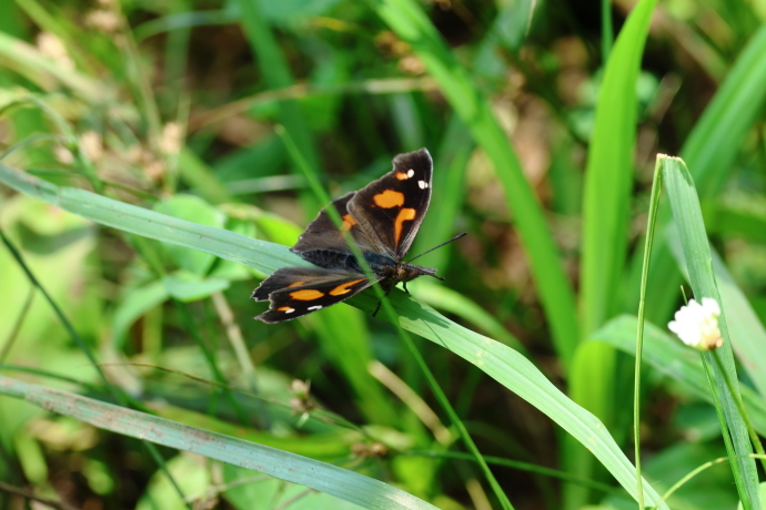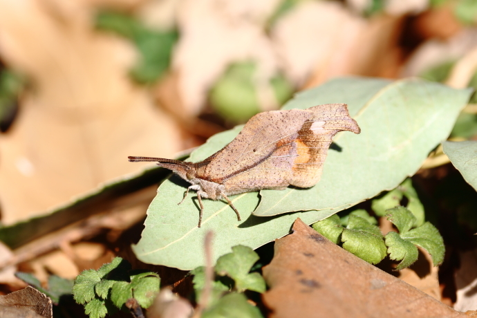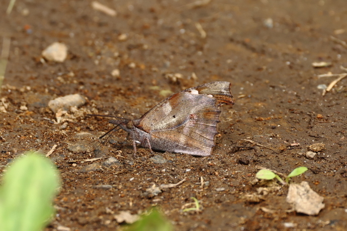翅の裏は枯葉そのものです。見事な擬態です。枯葉の中だけでなく土の上でも居場所が分かりにくくなります。翅を開いて静止することが多く、翅表の紋様を見せてくれます。