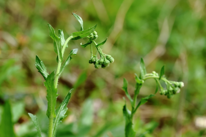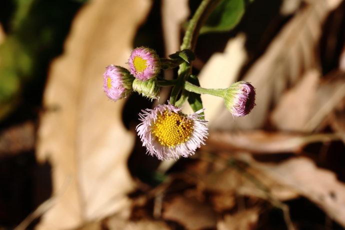こちらではすっかり茎が伸び、ハルジオンらしく、たくさんの蕾をつけて項垂れています。蕾のうちは下を向いていますが、花が咲くときには空を仰ぐように上を向きます。