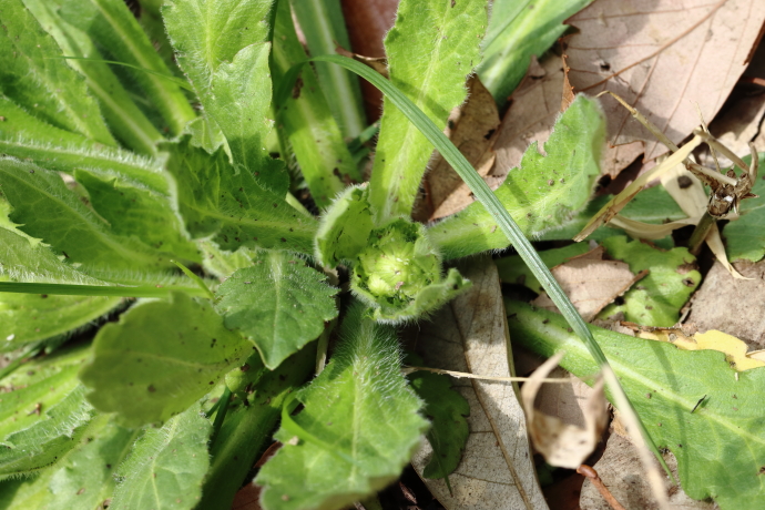 ハルジオンのロゼット。地に伏して寒さを凌いでいます。全体は軟毛に覆われ、葉柄には翼があります。中央では、花序が葉に包まれたまま顔をのぞかせています。もう春です。