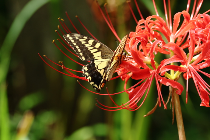 ヒガンバナと戯れています。ナミアゲハによく似ていますが、黄色みが強く、前翅の付け根部分が黒く塗りつぶされています。縞模様になるナミアゲハとは異なります。