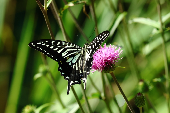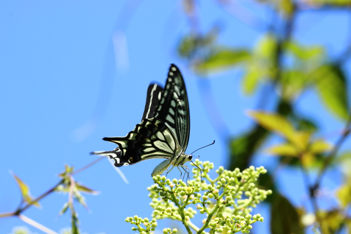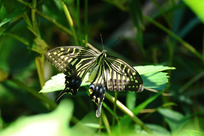アゲハチョウと言えば通常本種を指します。単にアゲハとも呼びます。前翅は黄白色の地に黒い縞模様が入り、後翅には後縁側に水色と淡い橙色の斑点が並びます。