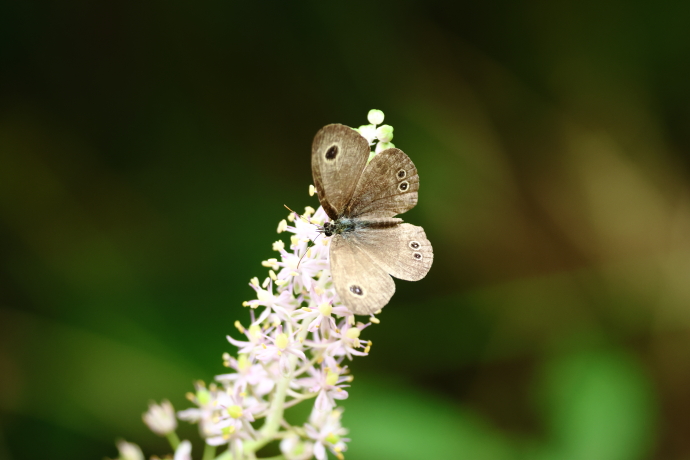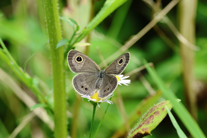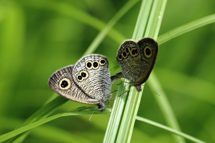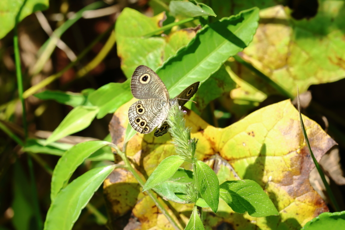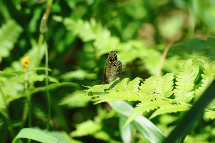 翅を閉じてシダの葉に止まっていました。翅裏には薄茶色の細かい波型模様があり、前翅に金環のある眼状紋が1つ、後翅には5つあります。まれに6つ以上のこともあります。