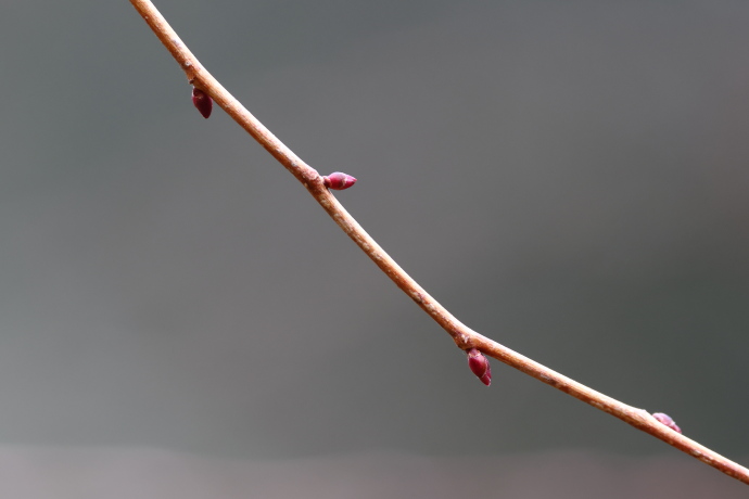 茎の節はジグザグに連なり、各節に紅紫色の冬芽が見られます。冬芽は互生し、紅紫色で、芽鱗は4枚ほど確認できます。頂芽は発達せず、側芽がふくらみます。