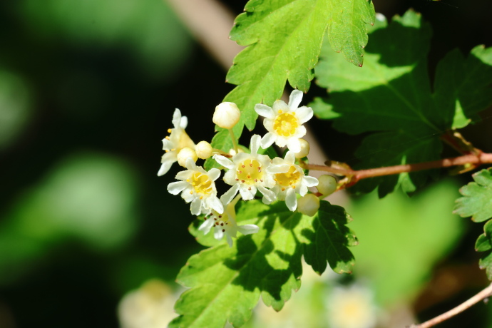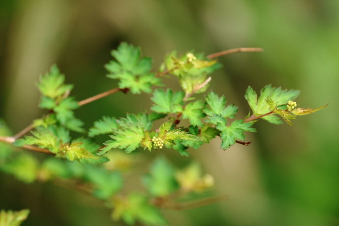 葉は互生し、三角状広卵形で、浅裂から中裂し、裂片の縁には重鋸歯があります。新緑の頃には、葉の基部寄りの中央部が黄色みを帯び、美しいグラデーションを描きます。