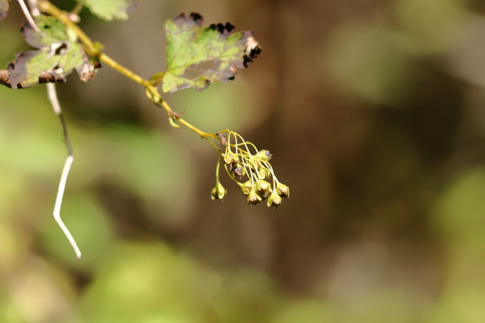 秋が深まり、葉が黄ばんできました。枝先には円錐花序が垂れています。よく見ると、萼片の陰に果実がついています。果実は球形の袋果で、中に種子が2個入っています。