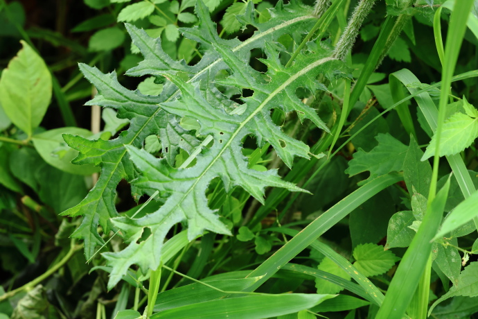根生葉の間から花茎を伸ばし、先端に頭状花序をつけます。総苞は球形で、総苞片は開かず、粘液を出して粘ります。総苞片が斜上し粘らないノハラアザミとは異なります。