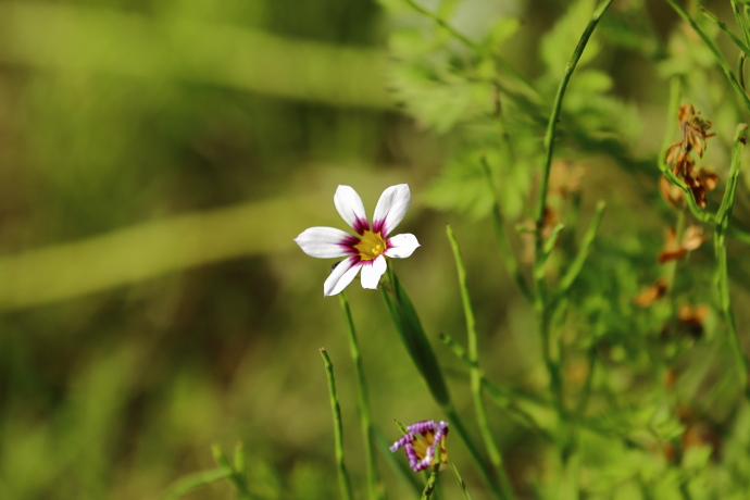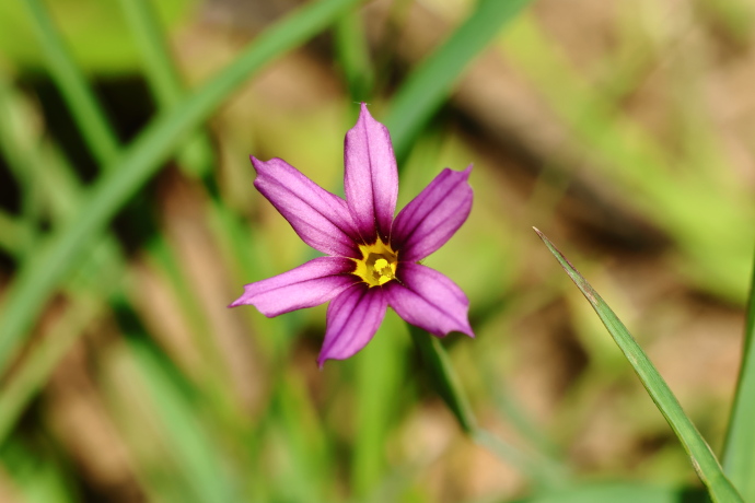明治時代に渡来した北アメリカ原産の帰化植物です。花被片には白色と紅紫色の個体があり、いずれも基部は紫色で、中央は黄色を帯びています。こちらの花は紅紫色です。