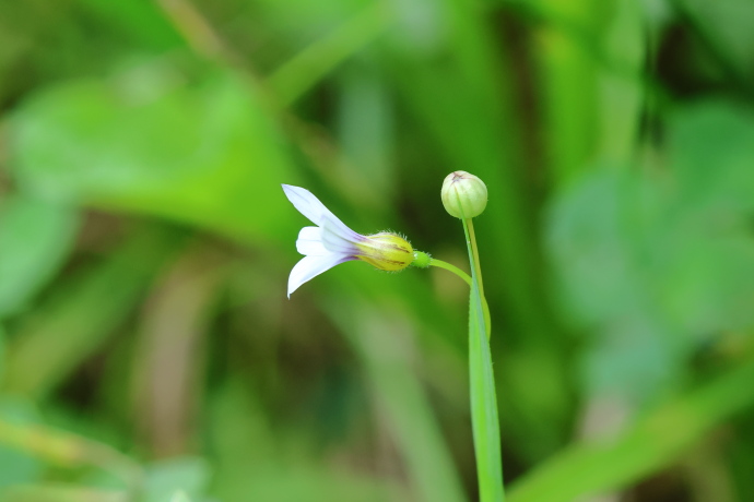 単子葉植物で、葉は細く槍状に上向きに伸びます。庭先でよく見かけ、葉がサトイモ科のセキショウに似ていることから名付けられました。こちらの花は白色です。