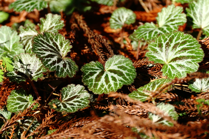 円形(腎円形)の根生葉が地面に張り付くように広がっています。どこか少し不気味な印象さえあります。走出枝を伸ばし、先端から根を出して新株をつくりながら繁殖します。