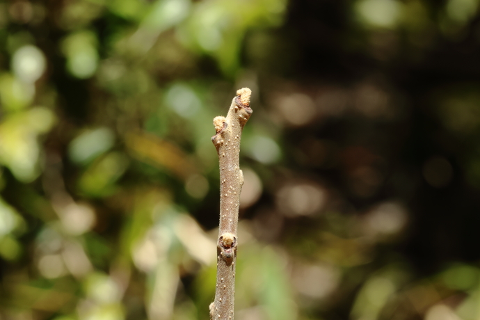 冬芽を付けています。半球状で、芽鱗は淡褐色の軟毛に覆われています。茎頂には仮頂芽が付き、側芽は互生します。葉痕はU字型~V字型で、茎に毛が密生しています。